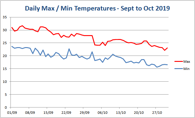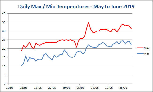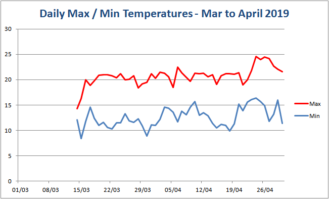 The following charts show the "shade" temperatures that we have recorded at our house from March 2019.