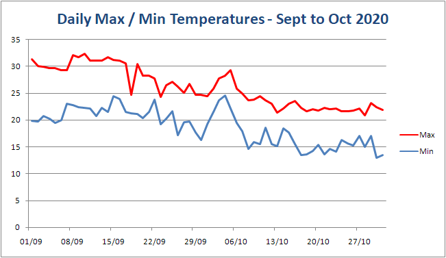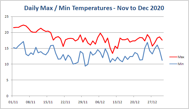 The following charts show the "shade" temperatures that we have recorded at our house from July 2020 (our return to Corfu was delayed due to Covid-19 travel restrictions).