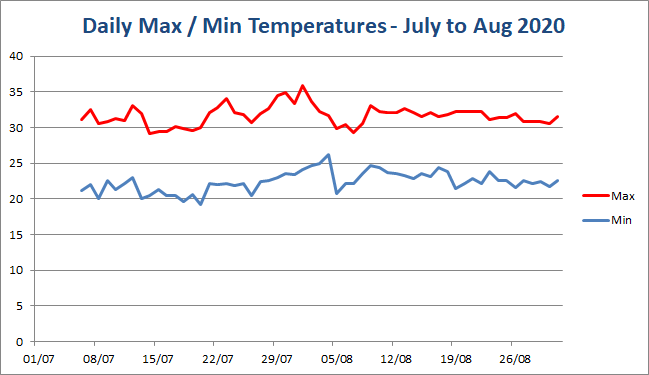 The following charts show the "shade" temperatures that we have recorded at our house from July 2020 (our return to Corfu was delayed due to Covid-19 travel restrictions).